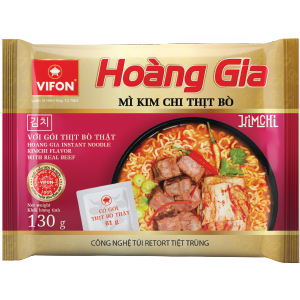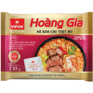 With a commitment not to use synthetic colorants, produced with modern processing technology and a closed process, Hoang Gia Instant Noodle Kimchi Flavor with 100% pure and fresh meat, packed with modern-closed sterilization technology helping to keep the nutritional content in the meat bag with the crispy noodles, and the rich soup will solve the consumer's time problems but still ensure the right nutrition of "Royal". With a balanced combination of the sour and spicy taste of kimchi along with the rich sweetness of beef, Hoang Gia Instant Noodle Kimchi Flavor With Real Beef 130gr is a great choice for a convenient meal.