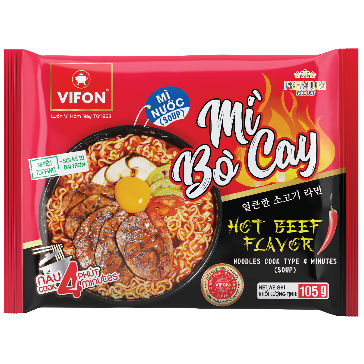 Noodles Cook Hot Beef Flavor with more toppings, faster cooking time - with only 4 minutes. Especially, the rich, spicy soup with the typical delicious flavor of beef and the cooked noodles are big, tough, and slippery will bring to consumers convenience, nutrition, and energy meal. With a commitment not to use synthetic colorants, standard product quality, manufactured with modern technology, VIFON always puts food safety and consumer health first.