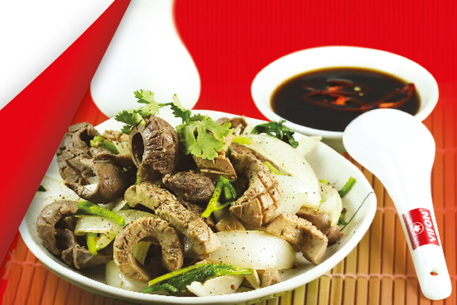 B1: Tim cật rửa sạch, thái miếng vừa ăn, có thể khứa xéo lên bề mặt cho đẹp. Ướp tim cật với bột canh VIFON, tiêu, đường trong 5 phút.