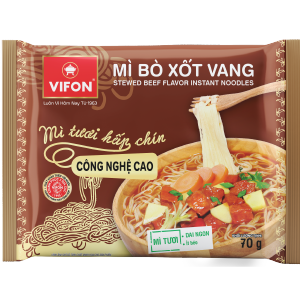 Mì Bò Xốt Vang VIFON được chế biến từ Mì tươi hấp chín sử dụng công nghệ cao, quy trình khép kín hiện đại, không sử dụng phẩm màu tổng hợp. Đặc biệt sợi mì tươi ít béo và thơm ngon bổ dưỡng sẽ mang lại trải nghiệm thú vị trong mỗi lần thưởng thức.
